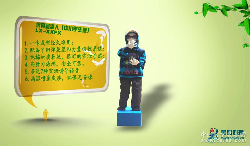 產品詳細介紹 小學版宣泄人、宣泄器材(靈心心理康復器材) 現在關注青少年的心理健康一度成為熱門話題。人們已越來越重視學生心理健康問題。長沙市靈心心理小學生版宣泄人及小學生版音樂放松椅均已在各小學咨詢室、心理宣泄室使用。 長沙市靈心康復器材有限公司竭誠為您供應最新版小學生仿真發聲宣泄人,靈心心理小學生版宣泄人不損壞身高170CM 、可擊打部位150CM。面部采用硅膠合成材料制作富有彈性,抗擊打能力強,內部裝有發聲器,在擊打不同部位的同時可發出幾種不同趣味求饒聲。 長沙市靈心心理還提供沙盤游戲,音樂放松椅,音樂放松器材,宣泄墻,團體活動包,心理測量軟件,心理音樂放松椅,心理沙盤等心理產品 咨詢電話:0731-82030198 移動電話:13875906290(劉敏) |