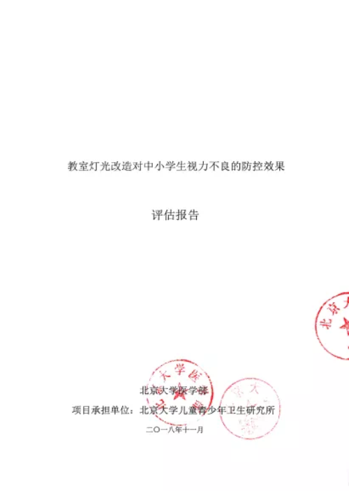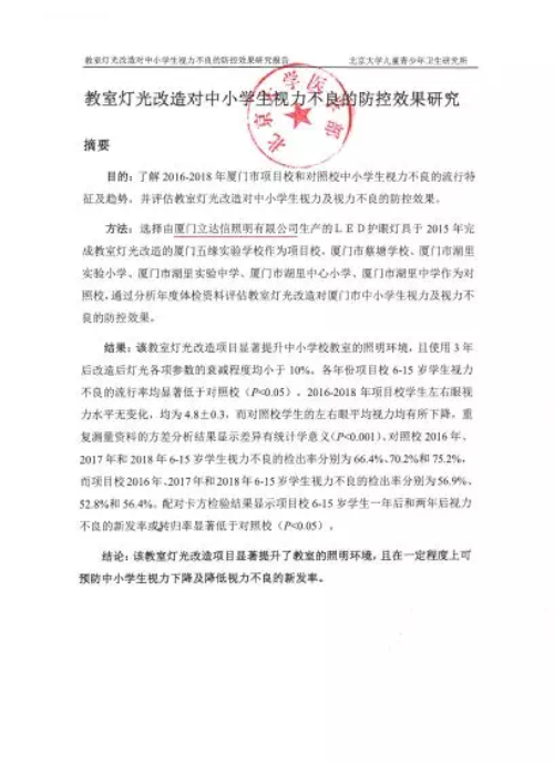 由北京大學(xué)醫(yī)學(xué)部、北京大學(xué)兒童青少年衛(wèi)生研究所出具的評(píng)估報(bào)告《教室燈光改造對(duì)中小學(xué)生近視不良的防控效果》顯示:立達(dá)信改造項(xiàng)目顯著提升了教室的照明環(huán)境,在一定程度上可預(yù)防中小學(xué)生視力下降及降低視力不良的新發(fā)率。