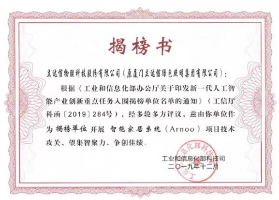 2020年1月13日,國家工業和信息化部《工業和信息化辦公廳關于印發新一代人工智能產業創新重點任務入圍揭榜單位名單的通知》,立達信成功入圍國家工信部新一代人工智能產業創新重點任務揭榜單位。