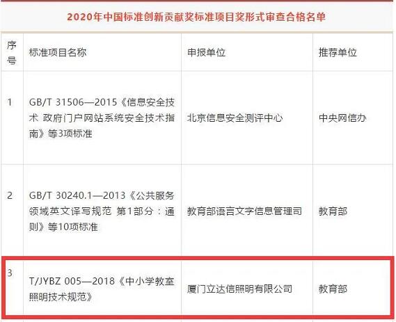《中小學教室照明技術規范》標準歸口單位為中國教育裝備行業協會,由立達信提出并牽頭起草。標準自2018年5月1號實施以來,取得了良好的社會反響,獲得多項榮譽:入選工業和信息化部2019年標準應用示范項目名單,今年更獲教育部推薦、經國家市場監管總局評選入選2020年中國標準創新貢獻獎形式審查合格名單。