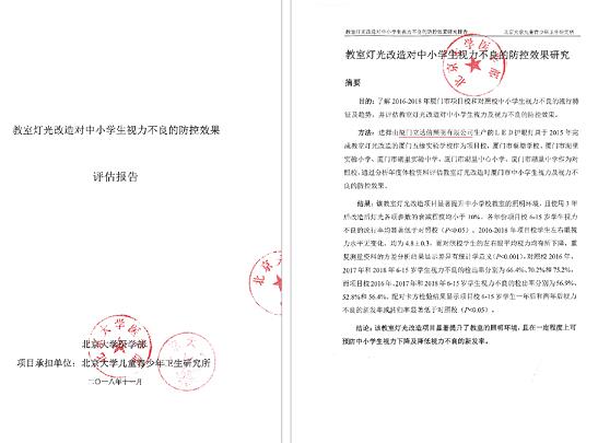 2015年,立達信首所健康光環境整校項目廈門五緣實驗學校改造完成。2018年,由北京大學醫學部、北京大學兒童青少年衛生研究所(國標GB7793-2010《中小學校教室采光和照明衛生標準》、國標GB40070-2021《兒童青少年學習用品近視防控衛生要求》主起草單位)出具的權威報告顯示:立達信健康光環境改造項目顯著提升了教室的照明環境,在一定程度上可預防中小學生視力下降和降低不良視力的新發率。
