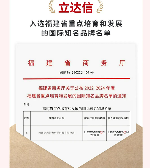同在近期,福建省商務廳正式公布了“2022-2024年度福建省重點培育和發展的國際知名品牌名單”,立達信憑借在照明及物聯網領域雄厚的研發創新能力、全球營銷服務能力和行業領先的生產制造能力,第三次榮獲入選。該項目是迄今為止福建省為數不多的官方在評品牌類獎項之一。