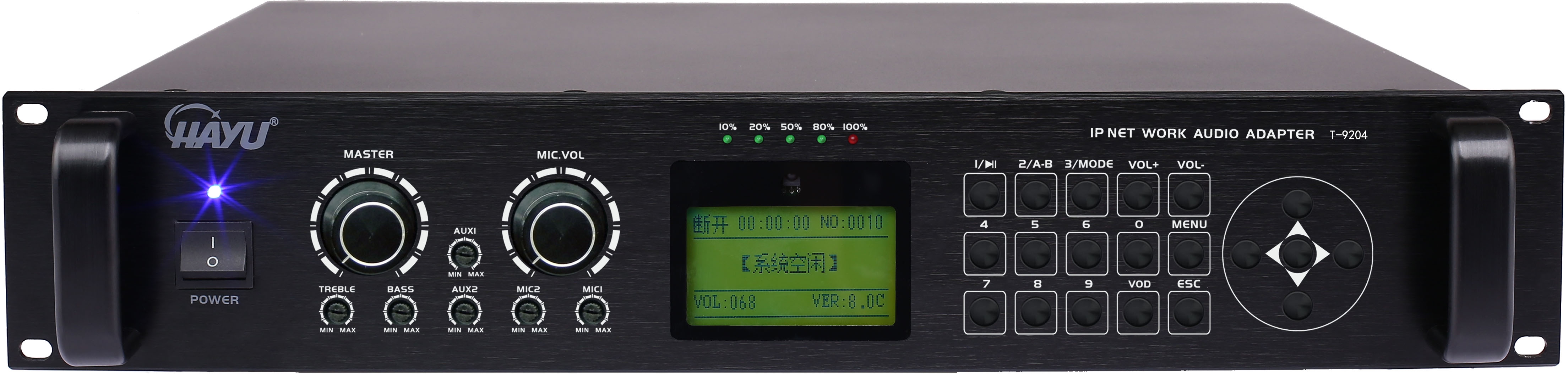 產品詳細介紹標準機柜式設計,黑色氧化鋁拉絲面板,人性化的抽手,考究的工藝,盡顯高檔氣質;高亮LCD顯示屏,人機操作使用面板操作鍵盤,人性化人機操作界面; 音頻采用硬解碼形式,內置硬件編解碼芯片,實現本地實時信號采集功能以及音頻解碼功能; 具有接收廣播呼叫、廣播功能:通過電腦可對單個或多個IP終端、分區、全區呼叫; 面板集成20位操作按鍵,可點播服務器中音頻文件,可輕松控制節目的快進、快退,播放、暫停及書簽設置;具有順序、循環等多種播放模式;設有雙向點播,可通過服務器軟件、終端鍵盤及遙控器自由點播服務器中節目; 設有2路本地線路輸入,2路話筒輸入接口,1路音頻輸出,每路設有獨立音量可調;自帶2*20W功放,能外接定阻音箱,支持DHCP自動獲取IP地址; 終端具有遠程優先功能,能實現自動強插功能,實現分級優先、緊急播音等; 終端內置智能電源管理功能,能外接周邊設備,如功放等設備,根椐聲音自動開啟或關閉外接功率放大器的電源; 具有三級信號優先功能,高級別可打斷低級別的廣播; 標配2路10/100M RJ45網絡交換機接口,接口無輸入輸出之分; 終端機能任意設置待機時間長短,時間可從:1—99分鐘之間任意設定,用戶可根據各個分區具體情況,來任意設定在任務結束后,多長時間關閉功放,以方便用戶舉行各類活動; 具有終端饋送功能,可直接通過終端本地操作或通過IP廣播軟件操作將能將任意一個終端的聲音通過網絡傳送到其它指定的一個或多個終端; 標配1路USB接口,支持U盤播放和錄音,能將本地的內容進行實時錄制; 支持全雙工雙向對講,自帶回聲消除功能; 可選配TF卡模塊,可實現斷網自動打鈴功能,能定時將服務器中的定時廣播任務自動更新到TF卡中,以保證在斷網時打鈴為最新的定時廣播任務; 可選配2A-24V強切模塊,可控制打開強切音量開關; 設有紅外線遙控器控制,可通過遙控操控終端的相關功能。 |