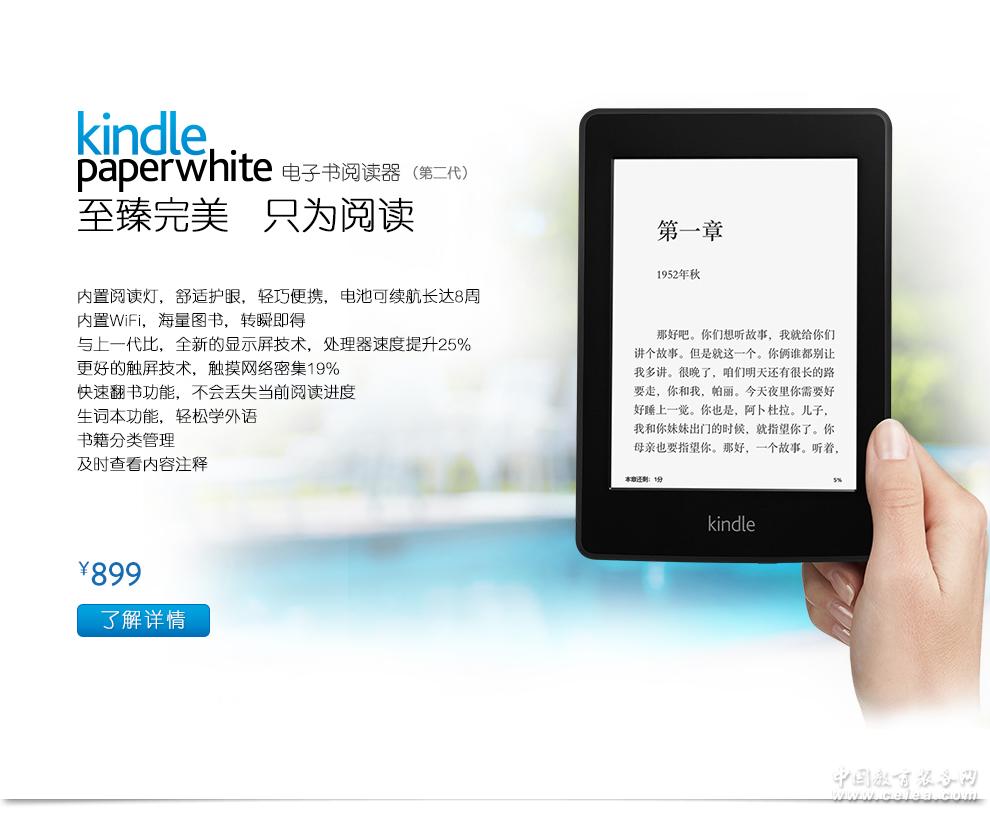 1.產品容量 4GB 2.文本格式 支持Kindle (AZW),TXT,PDF,MOBI,PRC原格式,HTML,DOC,DOCX,JPEG,GIF,PNG,BMP轉換格式 3.屏幕尺寸 6英寸 4.分辨率 1024*768像素 5.屏幕色彩 16階灰度 6.屏幕性能 〖Paperwhite〗顯示屏,內置閱讀燈 7.觸摸屏 獨家電子墨觸控觸控顯示屏技術 二、功能特點