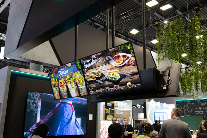 現場,一個疊拼標牌墻吸引了眾人駐足圍觀。該方案采用55英寸海信DM66D系列數字標牌產品+海信自研VisionInfo信發智控軟件,將6塊標牌錯落排列,實現內容無縫拼接。值得一提的是,DM系列憑借卓越性能,于2024年榮獲ISE展會“Best of Show 2024”大獎。該系列產品覆蓋32-100吋全尺寸段,滿足多樣化展示需求;具備500nits高亮、25%高霧面抗反光、支持7*24小時全天候工況、橫豎放、全系列能源之星認證節能環保,可實現公共信息展示、廣告播放、菜單選餐、信發集控,提供智慧零售和QSR場景解決方案。