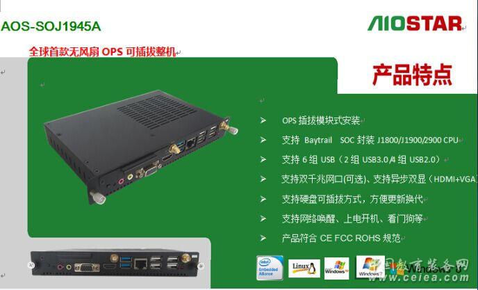 1概述編輯 Aiostar OPS 全稱為:Aiostar Open Pluggable Specification,開(kāi)放式可插拔規(guī)范。是Intel與顯示器廠商共同制定的標(biāo)準(zhǔn)化數(shù)字標(biāo)牌接口規(guī)范。OPS內(nèi)部組成是一個(gè)X86架構(gòu)的迷你PC,采用英特爾酷睿處理器,配有內(nèi)存、硬盤、多種輸入輸出接口以及Windows操作界面,尺寸為200mm x 119mm x 30mm 。 以下為Intel 官網(wǎng)對(duì)于OPS的定義: 原文如下: Digital Signage Open Pluggable Specification :Simplify digital signage development Highlights Enables easier installation, use and maintenance of digital signs. Makes digital signage devices more intelligent and connected. Overview The open pluggable specification (OPS) helps standardize the design and development of digital signage devices and pluggable media players. Intel created OPS to address digital signage market fragmentation and simplify device installation, usage, maintenance and upgrades. OPS enables digital signage manufacturers to deploy interchangeable systems faster and in higher volumes, while lowering costs for development and implementation. Installing digital signage equipment based on Intel architecture helps you implement scalable digital signage applications that can network easily with other equipment. This simplifies interoperability and application upgrades designed to meet the digital signage requirements of individual customers, while helping to future-proof technology investments.[1] 譯文: 強(qiáng)調(diào) 更便于安裝、使用和維護(hù)的數(shù)字信號(hào)。 使數(shù)字看板設(shè)備更智能和融合。 概述 開(kāi)放的可插拔的規(guī)范(OPS)有助于規(guī)范的設(shè)計(jì)和開(kāi)發(fā)數(shù)字看板設(shè)備,并插入媒體播放器終端。Intel創(chuàng)造OPS 致力于數(shù)字看板市場(chǎng)分化和簡(jiǎn)化設(shè)備安裝、使用、維護(hù)和升級(jí)。 OPS可以使數(shù)字看板制造商更快部署大量的交互系統(tǒng),同時(shí)降低開(kāi)發(fā)和實(shí)現(xiàn)的成本。 安裝基于英特爾架構(gòu)的數(shù)字標(biāo)牌設(shè)備可以幫助您實(shí)現(xiàn)可伸縮的數(shù)字看板應(yīng)用程序,并且很容易和其他設(shè)備進(jìn)行網(wǎng)絡(luò)連接。這簡(jiǎn)化了通過(guò)交互和升級(jí)的設(shè)計(jì)來(lái)滿足個(gè)人客戶的數(shù)字看板需求,同時(shí)有利于面向未來(lái)的技術(shù)投資。 2特點(diǎn)編輯 1、支持?jǐn)?shù)字標(biāo)牌等行業(yè)最新的OPS規(guī)范的電腦模塊,加速數(shù)字標(biāo)牌行業(yè)的標(biāo)準(zhǔn)化趨勢(shì)。 2、OPS模塊可以簡(jiǎn)化設(shè)備的安裝、使用、維護(hù)和更新,幫助數(shù)字標(biāo)牌制造商降低開(kāi)發(fā)和實(shí)施成本。 3、OPS可簡(jiǎn)便地與其它設(shè)備聯(lián)網(wǎng),可擴(kuò)展數(shù)字標(biāo)牌應(yīng)用,滿足數(shù)字標(biāo)牌對(duì)交互和應(yīng)用更新的需求。 4、部分OPS平臺(tái)支持遠(yuǎn)程管理及低功耗模式,解決耗電及散熱要求。同時(shí)平臺(tái)所支持的Intel vPro、AMT遠(yuǎn)程管理技術(shù),實(shí)現(xiàn)設(shè)備無(wú)人操控下的高效運(yùn)作。如采用四代i5+Q87平臺(tái)的AOS-SOQ8I45A 5、OPS無(wú)風(fēng)扇散熱設(shè)計(jì),提供超靜音的解決方案,保證工作環(huán)境的安靜、清爽。發(fā)熱量小也帶來(lái)了較小的功耗。 3整機(jī)編輯 Intel 2011年提出該規(guī)范后,伴隨著日本NEC OPS接口顯示器的上市,傳統(tǒng)數(shù)字標(biāo)牌嵌入式主板走下神壇,OPS模塊化正式開(kāi)啟。代表作品有 愛(ài)鑫微電子(AIOSTAR) AOS-SOH8I45A ,