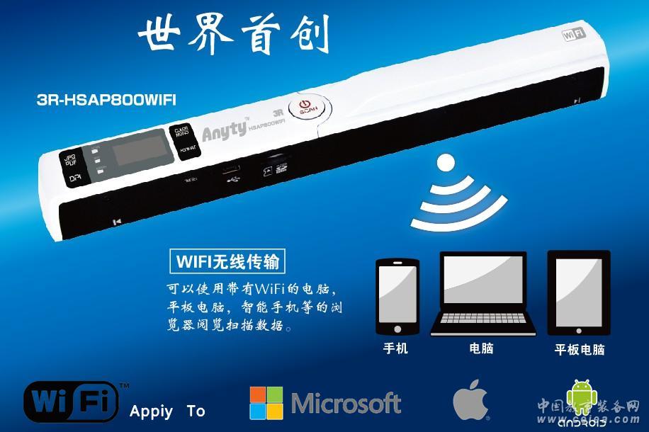 產品推薦: Anyty(艾尼提)便攜式WIFI無線掃描儀3R-HSAP800自2012年11月起正式上市銷售,由于該產品是全球首款便攜式WIFI無線掃描儀,同時也是當今世界最小的A4整頁掃描能夠達到900DPI分辨率的便攜式掃描儀;就其突破性的革新,將從下面三個方面來進行總結: 1、從分辨率上面來說,3R-HSAP800是目前市面上銷售的便攜式掃描儀或掃描筆領域中掃描分辨率能夠達到900DPI的比較高的一款,能夠清晰、真實再現掃描資料的內容; 2、WIFI無線發送,3R-HSAP800是便攜式掃描儀領域第一次采用WIFI無線發射技術,可以讓用戶通過其他顯示設備立刻檢測到掃描的效果圖片。 3、圖片保存方式可選,目前可以選擇JPG或者是PDF進行資料的存儲。