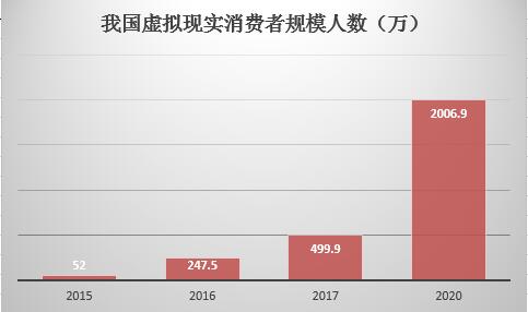 虛擬現(xiàn)實技術已經逐步的融入到人們的日常生活中,用戶規(guī)模不斷提升。數(shù)據(jù)顯示,2015年至2017年我國虛擬現(xiàn)實消費者規(guī)模為52萬人、247.5萬人、499.9萬人,據(jù)中商產業(yè)研究院預測,2020年規(guī)模將達到2006.9萬人。