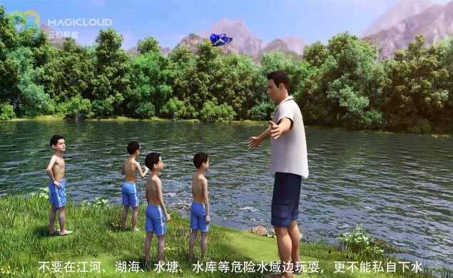 云幻科教3D安全教育資源庫中,防溺水系列安全知識包括安全位置指引、不同情況溺水自救指引、他人溺水救護指引等多個內容,模擬真實的場景進行安全教育。新穎的教育形式吸引學生的學習興趣,近乎真實的形象讓學生將知識深深的記憶在頭腦中, 在需要的時候很容易的回想起來。