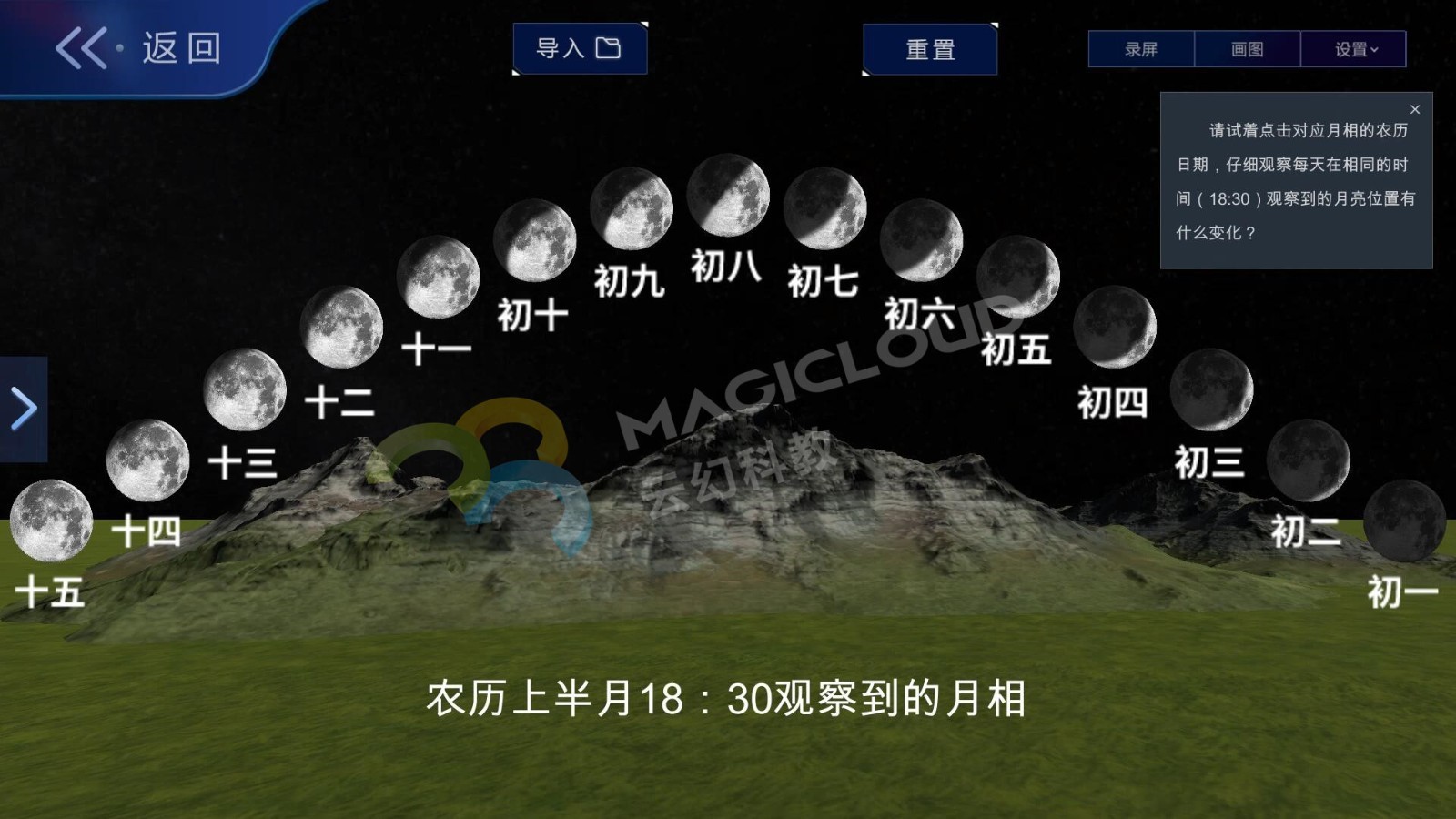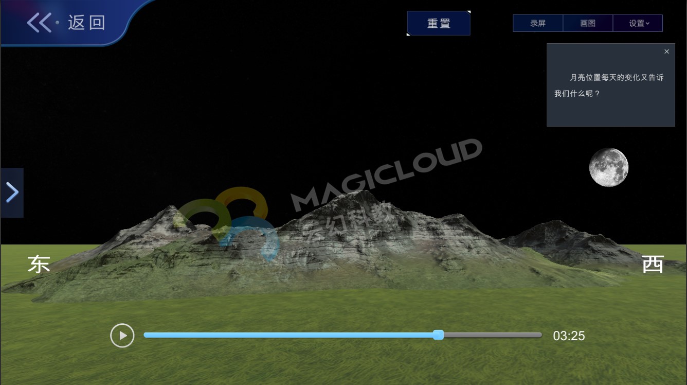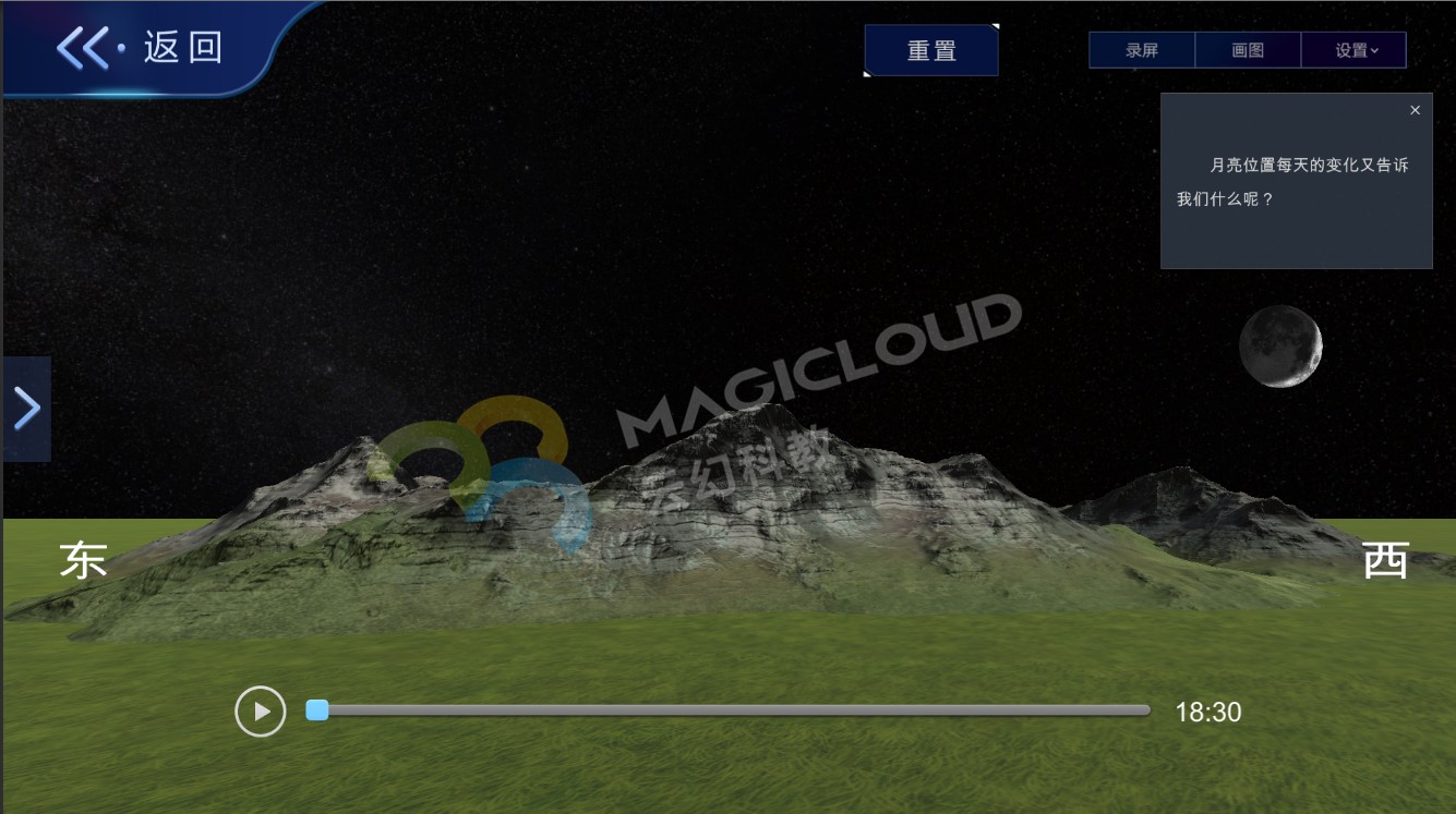 在教學過程中,不僅僅是要學生學得月相變化的知識內容,更是幫助學生完成科學概念的建構,培養學生良好的科學思維和科學態度。云幻科教VR仿真實驗平臺從課本教材出發,提供專業、全面的教學內容,引導學生對物質世界有更深刻的認識,同時對教學內容進行擴充,將科學知識與生活場景關聯,讓學生能夠用所學的知識解釋生活中的有關現象、解決有關實際的問題,引導學生在已知內容基礎上進行再創新與再創造。