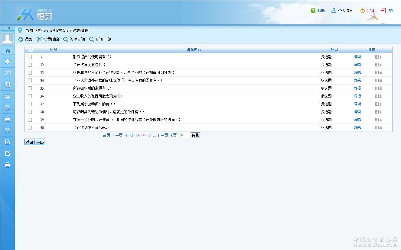產品詳細介紹系統特點 按科目、章節添加題目,題型多樣。 試題區分難易程度。 支持斷點續考,定時保存。 客觀題自動判卷;主觀題關鍵字閱卷。 支持多達1000人同時考試。 不同維度對學生成績進行分析統計。 系統功能 (1)自定義試題庫管理系統目錄�?梢园磳I、學科、章節等進行目錄細分。 (2)試題錄入和試題批量導入。 (3)強大的試題編輯功能。 (4)靈活的試卷構造功能,用戶可自定義試卷標題、試題數量、總分、試題難度系數、分數標注等。 (5)生成試卷文檔格式標準通用。能夠合理使用,有效再編輯,保存,方便瀏覽和打印輸出。 (6)題庫管理,可以隨時分散和集中管理題庫數據。 |