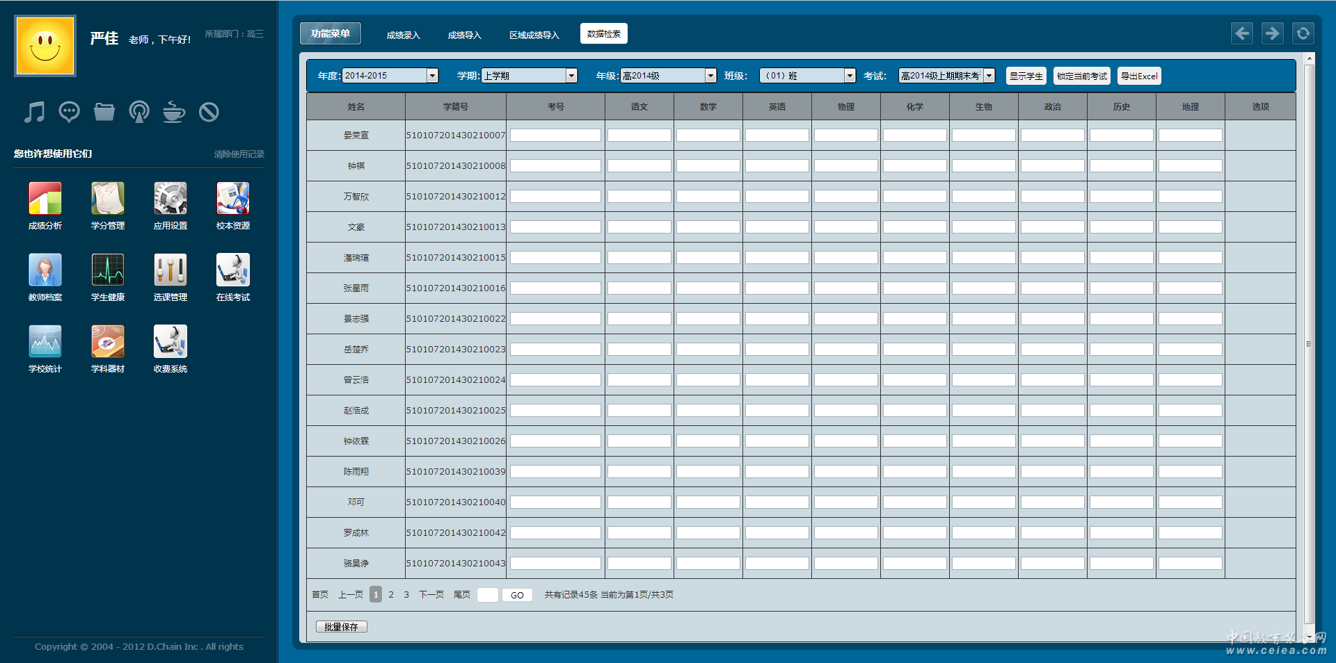 自定義考試項目 包含對考試名稱的設置、考試年度學期、考試針對的年級、考試科目設置、科目優生、及格分數線設置、科目是否分AB卷設置、計算公式調用、科目折合分設置等項目。 計算公式管理 根據每次考試需要的非總分成績統計項設置,XML文件的讀寫、節點操作。 成績折合系統 根據折合基礎設置,將分數轉化為任意形式的成績結果。 成績管理 包含班主任對本班所有學生成績添加、編輯,任課教師對所執教科目成績添加、編輯,教務處對整個年級學生成績上傳功能,還包含成績上傳模板的下載。 成績鎖定 成績審核無誤后對成績進行鎖定,不允許成績進行變更。 |