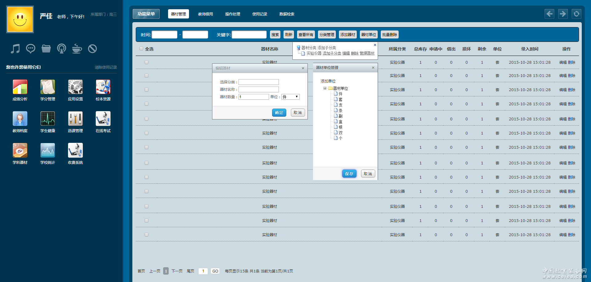器材管理 實(shí)現(xiàn)對(duì)器材分類、類型、基本情況等器材信息的綜合管理。 器材借用 對(duì)器材使用班級(jí)、使用時(shí)間、使用教師等器材借用信息的綜合管理。 器材歸還 對(duì)器材歸還的時(shí)間、保管情況等信息的記錄。 操作記錄 對(duì)器材的錄入、刪除、借還等操作類信息的綜合性記錄。 使用記錄 對(duì)各類器材使用情況的匯總記錄。 |