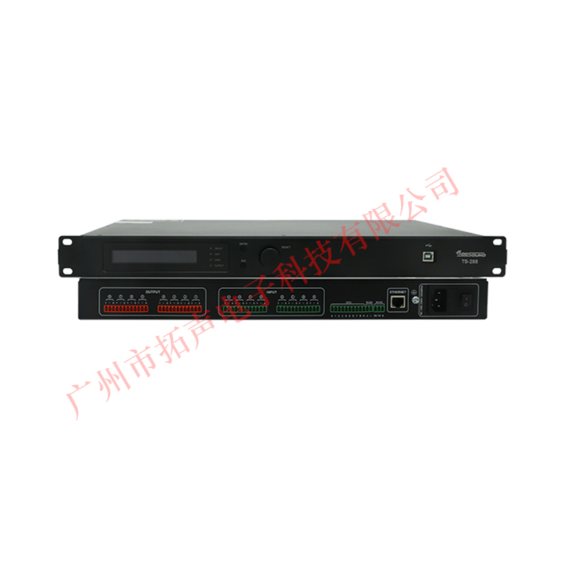 產品詳細介紹拓聲科技TS-288 數字音頻管理矩陣 產品介紹 此設備是一款8進8出的自動混音媒體矩陣,配備8路模擬輸入和8路模擬輸出,內置回聲、混響、反饋抑制、自動混音、矩陣混音、均衡器、分頻器、壓縮器、AEC(回聲消除)、ANC(噪聲消除)等DSP功能,此設備通過USB免驅連接電腦軟件控制,RS232,RS485,TCP/IP連接中控遠程控制,適合用在各種場合的擴音工程。