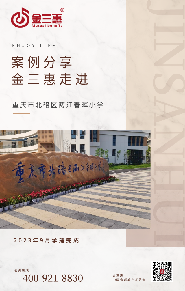 2023年9月,金三惠數字音樂教室走進重慶市北碚區兩江春暉小學,為學生提供了45+1電鋼琴教室,配備了金三惠電鋼琴教學系統、電鋼琴、數字音樂教學儀等教學教具等。