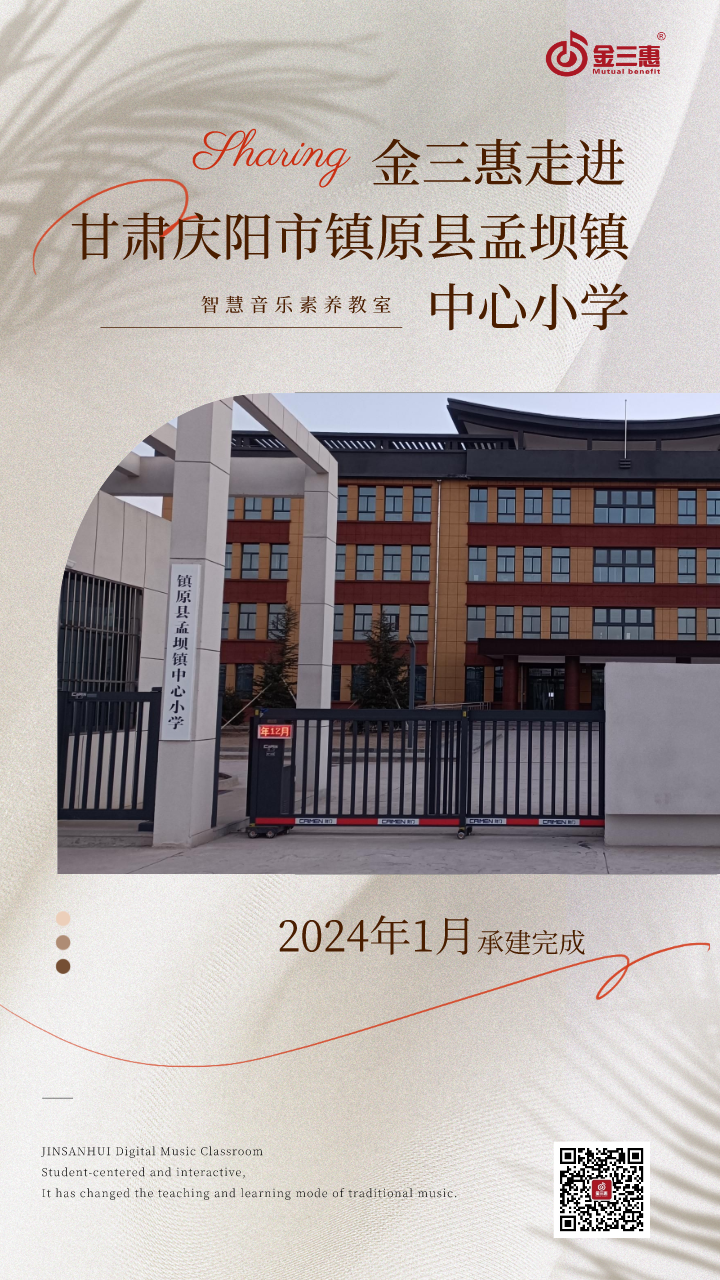 2024年1月,金三惠數字音樂教室為甘肅省慶陽市鎮原縣孟壩鎮中心小學(西區小學校區)提供、安裝、培訓的26+1智慧音樂素養教室正式開始使用!配備了金三惠教學系統、電鋼琴、數字音樂教學儀等教學教具。