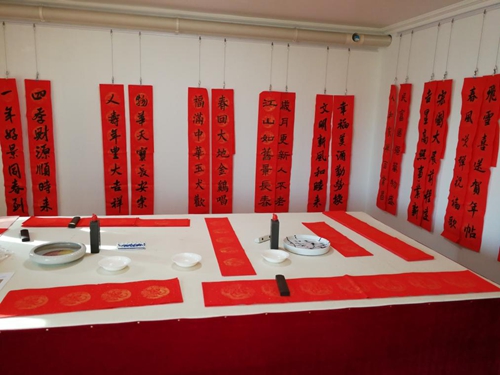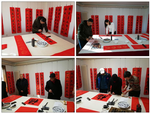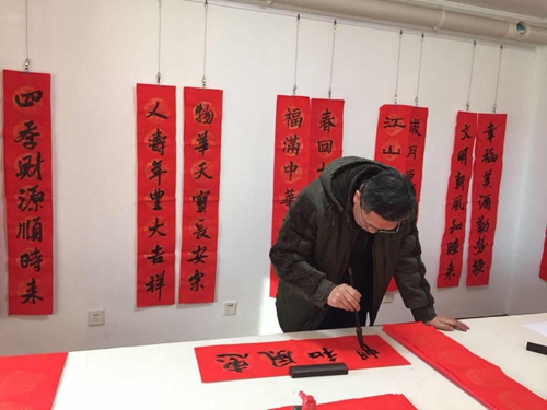中國書法家協(xié)會理事高軍法在大家期待的掌聲中,開始揮毫潑墨。一幅幅寫滿祝福的春聯(lián)躍然于紅紙之上,濃濃的情意、真誠的祝福溢于字里行間。他談到:“寫春聯(lián)寄托著一種文化情懷,看似寫字,其實是總結(jié)過去一年的收獲,對新的一年的展望和期盼。”與印刷春聯(lián)不同的是,用傳統(tǒng)的筆墨把想說的話寫進春聯(lián)里掛起來,不僅美觀,寓意也好,這就是書法結(jié)合春聯(lián)所具有的獨特魅力。