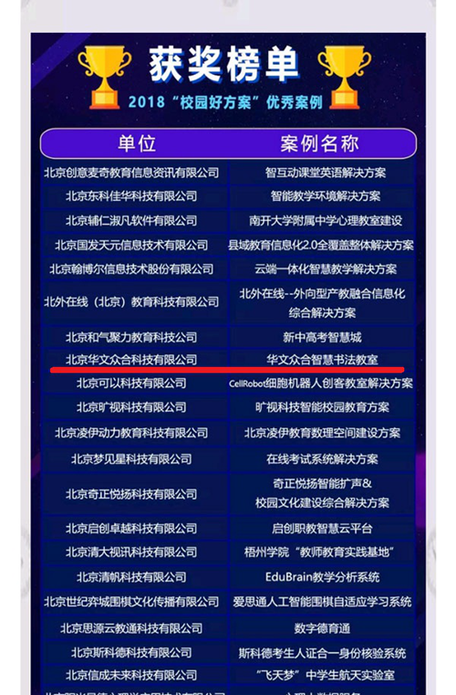 國際智慧教育展組委會聯(lián)合主辦的“第五屆校園好方案”評選活動,入選2018“校園好方案”優(yōu)秀案例榮譽(yù),書法教學(xué)類僅此一家。