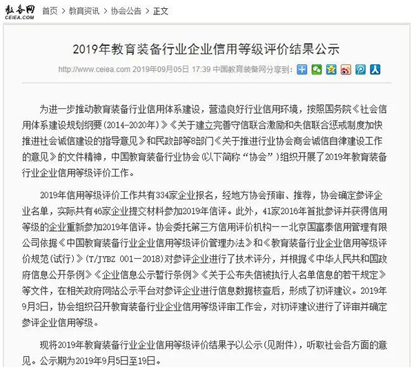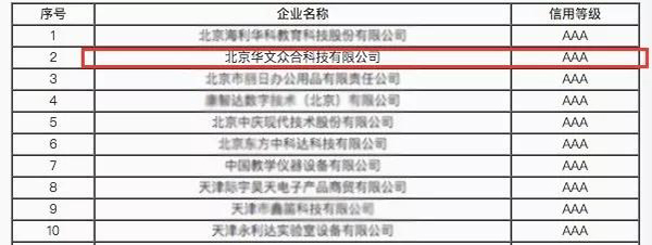 為營造良好行業(yè)信用環(huán)境,中國教育裝備行業(yè)協(xié)會組織開展了2019年教育裝備行業(yè)企業(yè)信用等級評價工作。近日,評價結(jié)果出爐并公示,北京華文眾合科技有限公司(以下簡稱“華文眾合”)被評為AAA級信用企業(yè)。此次共78家企業(yè)被評為AAA級,8家企業(yè)被評為AA級,1家企業(yè)被評為A級,與華文眾合一同被評為AAA級的還有科大訊飛、長虹電器等知名企業(yè)。