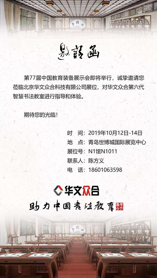 2019年10月12日至14日,以“展示、交流、合作、發(fā)展”為主旨的第77屆中國教育裝備展示會將在青島世博城國際展覽中心舉行。華文眾合將攜最新產(chǎn)品——第六代智慧書法教室亮相本次展會,在N1館N1011恭候您的光臨。
