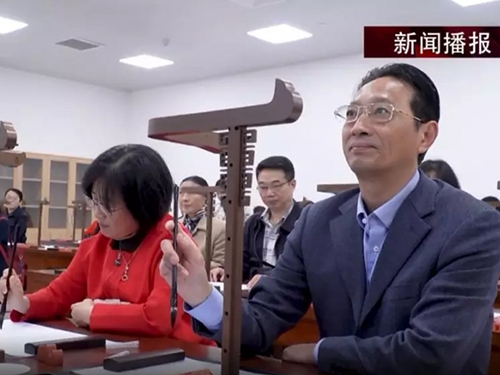教育部離退休干部局黨委書記、局長于虹(左)體驗華文眾合智慧書法教室