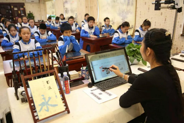 白沙小學的“墨韻工作坊”由華文眾合智慧書法教室而打造。教室充滿古韻又不失現代科技感,深受學生喜愛。