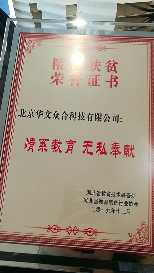 2019年12月,華文眾合給湖北省恩施州巴東縣信陵鎮民族實驗小學捐贈了一間智慧書法教室,獲得了湖北省教育裝備行業協會授予的愛心企業獎牌。