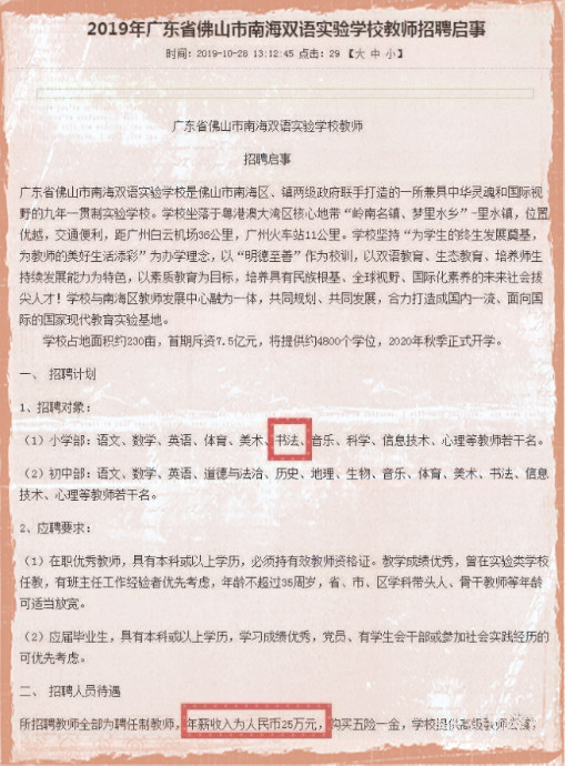 2019年10月佛山市南海雙語實(shí)驗(yàn)學(xué)校的教師招聘啟事,小學(xué)部和中學(xué)部都招聘書法老師,年薪25萬元人民幣、購買五險一金、提供高級教師公寓。