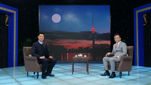 圖片說明:華文眾合董事長做客央視《逐夢年代》 與主持人朱軍暢談智慧書法教育