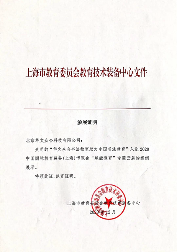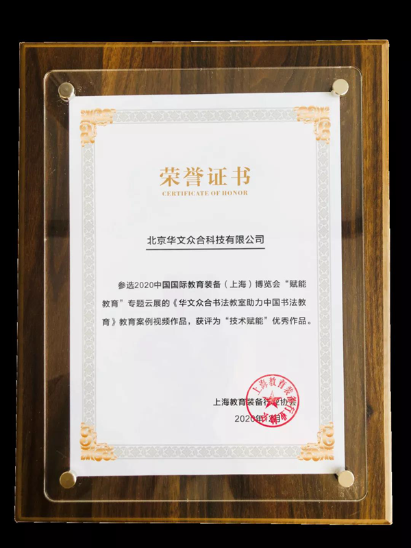 參選2020中國國際教育裝備(上海)博覽會“賦能教育”專題云展的《華文眾合智慧書法教室助力中國書法教育》教育案例視頻作品,獲評為“技術賦能”優秀作品