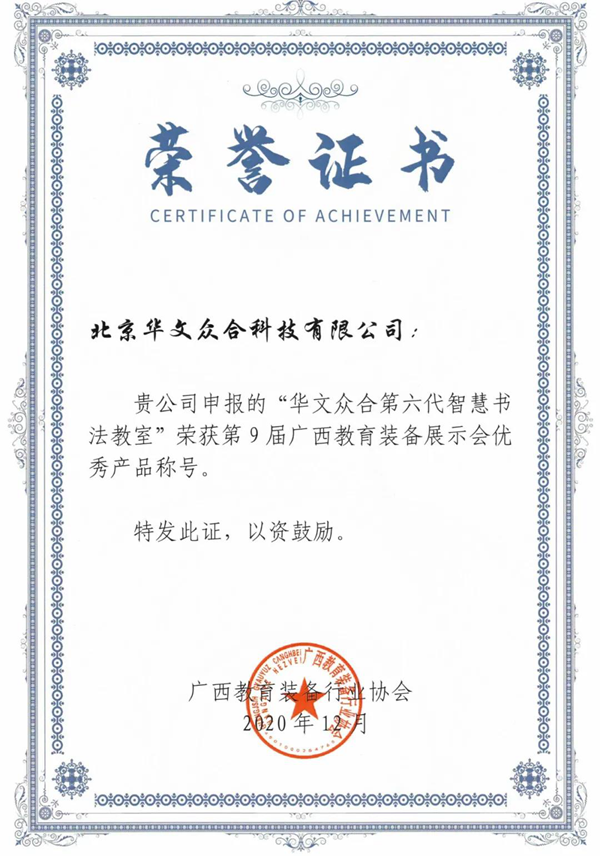 不得不提的是,華文眾合在致力于成為具有大局觀和責任感的教育企業的道路上,積極推動智慧書法教育,引領教育行業更具包容性和創新性的新趨勢。同時華文眾合作為教育裝備行業的優質品牌,用一項項榮譽向大眾展示了一個誠信經營、高信用等級、質量服務信譽的企業形象。
