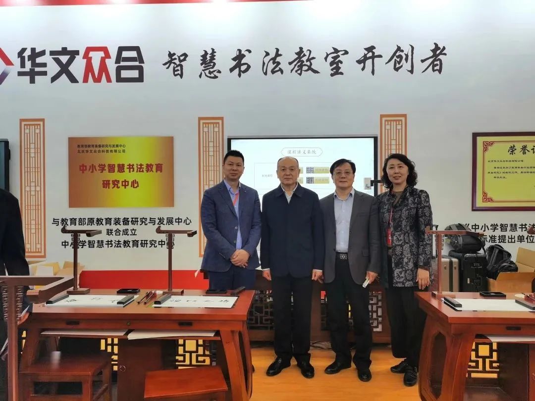 河北省教育裝備行業(yè)協(xié)會會長郭國維(左二)、河北省教育廳裝備中心主任郭晉寶(右二)、河北省教育裝備行業(yè)協(xié)會秘書長鄭秋輝(右一)蒞臨華文眾合展位指導