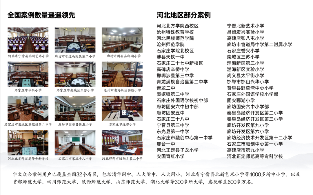 華文眾合多年來不遺余力致力于智慧書法創(chuàng)新,讓傳統(tǒng)書法文化在新時代以數(shù)字化、智能化的方式得以發(fā)揚與傳承。此次河北教育裝備展,華文眾合第8代智慧書法教室、智慧粉筆教室的出彩表現(xiàn)讓我們看到了書法教育現(xiàn)代化的新希望。華文眾合始終在智慧書法領(lǐng)域不斷研發(fā)創(chuàng)新,為師生做好書法教育服務(wù)工作,實現(xiàn)助力書法教育高質(zhì)量發(fā)展。目前,華文眾合智慧書法教室案例數(shù)量覆蓋全國32個省區(qū)4000多所中小學、300多所大學,其中包括清華大學附屬中學、中國人民大學附屬中學、中國人民大學附屬小學、首都師范大學等名校,惠及學生600多萬名。