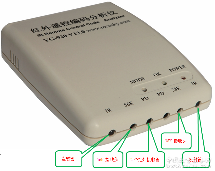 【采樣設(shè)備特點(diǎn) 】 YG-920 V13.0 支持在線升級(jí)固件程序, YG-920 V13.0 采樣器采用32位處理器,100MHz主頻,高精度測(cè)量,0.1微秒級(jí)分辨率。 YG-920 V13.0支持紅外發(fā)射功能。 USB2.0接口,快速傳輸數(shù)據(jù),提高批量測(cè)試速度。 支持最長(zhǎng)8秒采樣時(shí)間,最長(zhǎng)1024位的遙控指令,確保能正確接收所有彩電、VCD、DVB、空調(diào)等遙控器指令。 同時(shí)保留RS-232接口,兼容早期電腦。 直接接收遙控器發(fā)出的信號(hào),不必拆開遙控器。 支持38K載波、56K載波、非38K載波、無載波紅外遙控信號(hào)。 支持載波頻率測(cè)試。 支持信號(hào)強(qiáng)度測(cè)試。 雙紅外管接收。