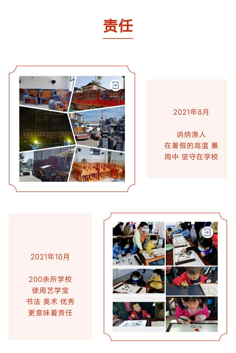 擁有自主開發的系列產品,涉及中國傳統文化書畫教室、老師成長和提升的教研產品、增賦減負備授課工具、提升優質資源均衡的結對課堂。自主研發產品:課堂評價-愛評課、美術教絡系統-藝學寶、數字臨摹書法教室-藝學寶、互動結對課堂、名師專遞課堂。配套硬件產品:藝板繪畫屏、藝學寶書法臨摹全貼合屏,產品優勢:數據采集與運用、互聯網+等創新運用在教學和教研,助力英音美薄弱學科的師資水平提升和名師課堂發揮普惠作用。