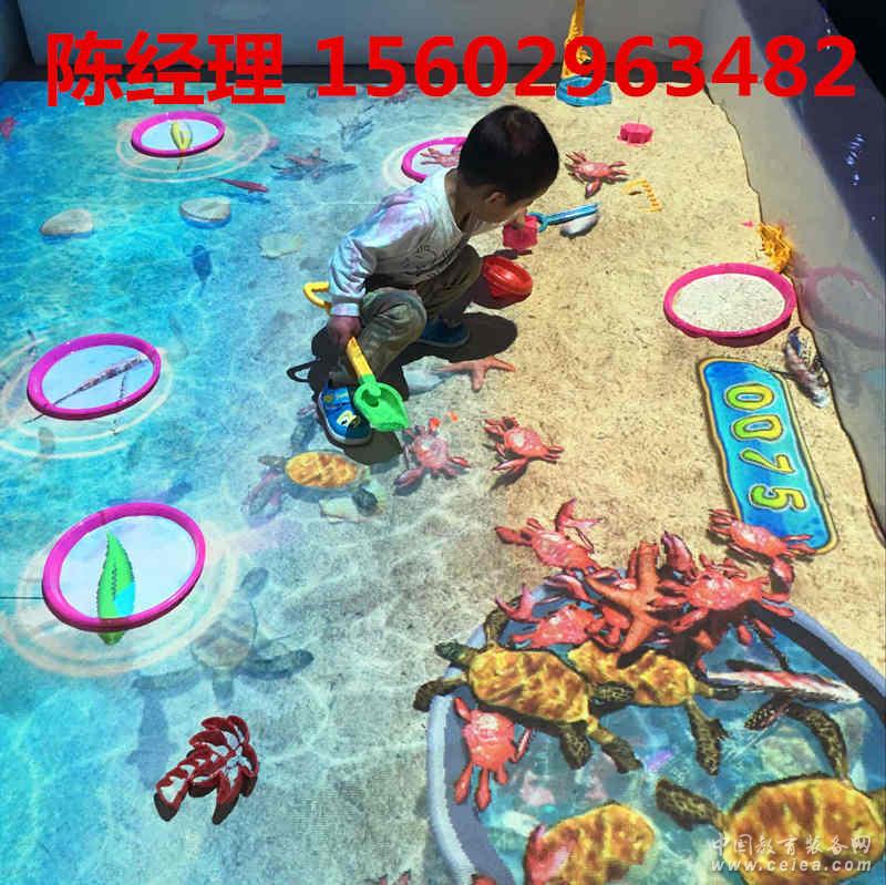 產品玩法: 小朋友置身虛擬現實的海洋場景中,沙灘邊散落投影著時隱時現的海星、貝殼、海螺,還有可寄放小朋友捕撈成果的魚缸。小朋友可以“下�!辈遏~,將魚兒存放到岸邊的魚缸里。還有農場場景,小朋友可以為種子施肥、澆水,等開花結果后,還可以采摘收獲果實,體驗有趣的農家樂……