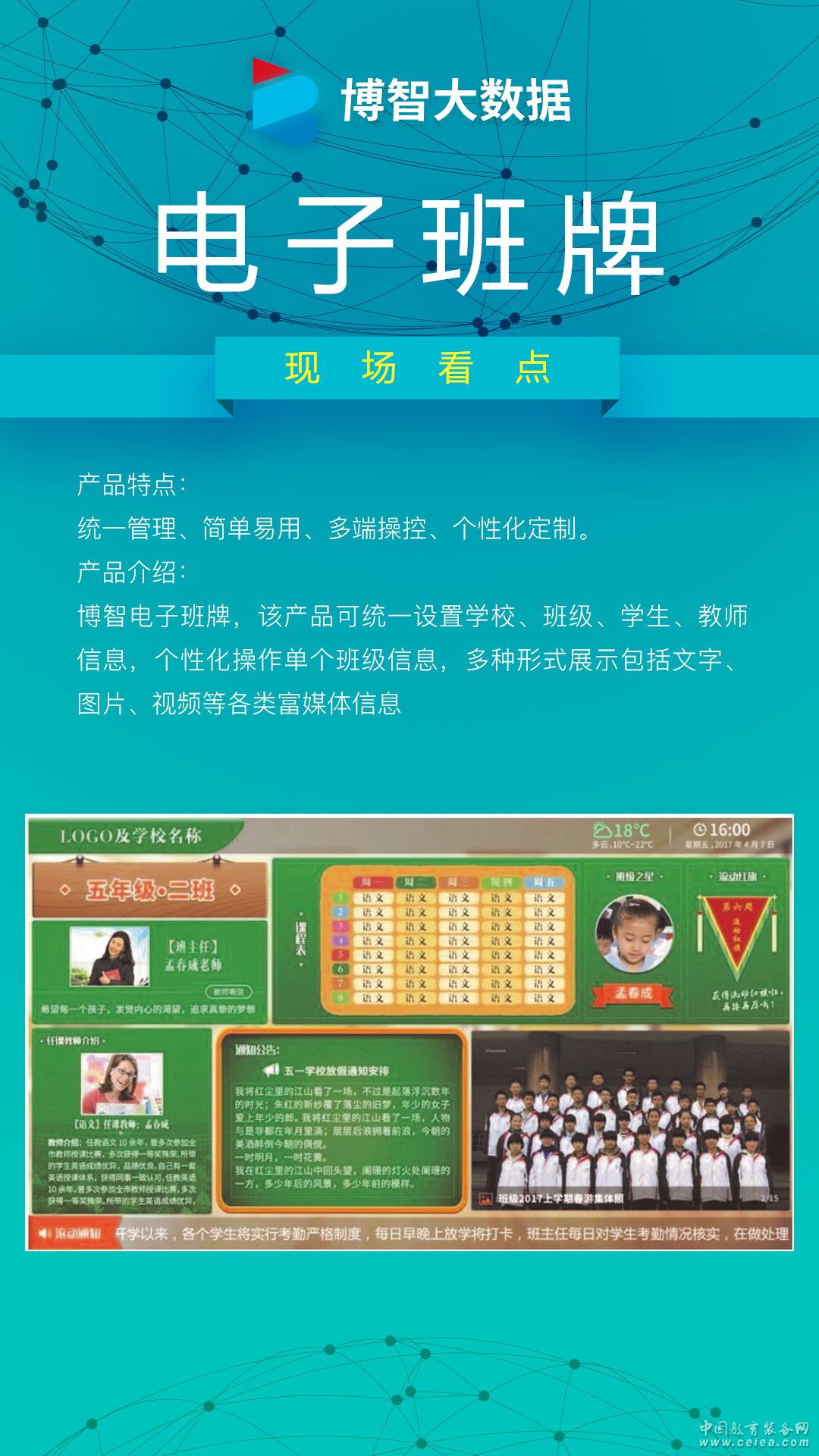 產(chǎn)品詳細(xì)介紹博智電子班牌,該產(chǎn)品可統(tǒng)一設(shè)置學(xué)校、班級(jí)、學(xué)生、教師信息,個(gè)性化操作單個(gè)班級(jí)信息,多種形式展示包括文字、圖片、視頻等各類富媒體信息。 產(chǎn)品特點(diǎn): 統(tǒng)一管理、簡(jiǎn)單易用、多端操控、個(gè)性化定制。