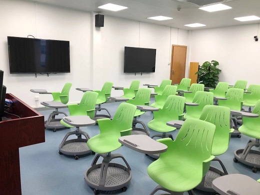 教室前方兩個(gè)拼接大屏和兩個(gè)顯示屏,在左右兩邊分別設(shè)有3個(gè)小組顯示屏。課桌椅接可自由移動(dòng)和拼接,可分排分列布置或環(huán)繞形成小組。
