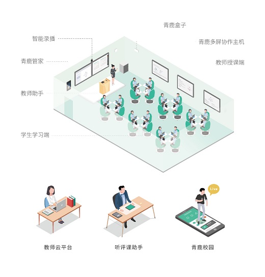 青鹿智慧課堂從實際教學場景出發,以業內首臺嵌入式架構盒子——青鹿盒子為核心,為學校教學量身打造了青鹿智慧教學整體解決方案。針對不同的教學場景,青鹿為教學提供標準智慧課堂、研討型智慧課堂、跨校區協作智慧課堂等多種智慧課堂解決方案。