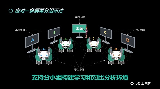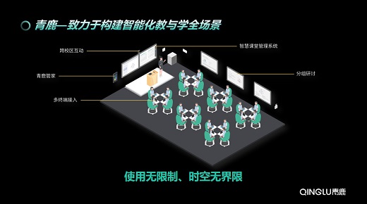 青鹿的無限課堂主要包含智慧課堂管理系統、多屏分組研討系統、跨區域互動系統、多終端接入系統、以及青鹿管家(智能管控)。由這些系統共同構建的全場景智能化教學空間,讓師生體驗到“時空無界限,使用無限制”的智能化教學模式。