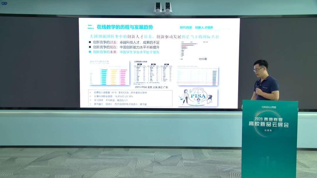 劉廣博士圍繞“后疫情時代,教學(xué)改革的趨勢與學(xué)習(xí)空間建設(shè)實踐”這一話題,針對“COVID-19疫情的影響”、“在線教學(xué)的歷程與趨勢”、“學(xué)習(xí)空間的標(biāo)準(zhǔn)化建設(shè)”三大主題為大家進行了詳細的講述。疫情之下的教育教學(xué)如何展開,成為了眾多教育者思考的問題。教育行業(yè)整體在這時遭遇了危機,線上教育則迎來了在變局中開新局的重要機會。隨著科技的快速發(fā)展,傳統(tǒng)的線下教育顯露出了諸多弊端,例如教育制度僵化、同質(zhì)化和缺乏個性化以及大班教學(xué)的方式抑制了學(xué)習(xí)的個性化和學(xué)習(xí)的廣度。通過線下與線上教育相結(jié)合的方式,這一系列弊端將會漸漸被革除,這樣做最直接的受益者是受教育者與教育者雙方:教育者通過信息技術(shù)的支持對受教育者進行靈活化的教學(xué),受教育者也在其中進行個性化的學(xué)習(xí)。這樣靈活的教學(xué)與個性的學(xué)習(xí),將使受教育者的創(chuàng)新思維逐步得到培養(yǎng),也將大大提高受教育者的創(chuàng)新水平。在國家發(fā)展中,從大國到強國的轉(zhuǎn)變中,創(chuàng)新人才的培養(yǎng)、創(chuàng)新驅(qū)動的發(fā)展成為當(dāng)下的國際共識,通過多組數(shù)據(jù)分析,劉廣博士從我國創(chuàng)新競爭的過去講述到創(chuàng)新競爭的未來。在未來,中國學(xué)生學(xué)業(yè)水平將處于領(lǐng)先地位。而在這一發(fā)展變化過程中,線上教育的介入,智慧課堂的建設(shè)發(fā)揮了不容忽視的作用。未來教育的發(fā)展將展現(xiàn)新的教學(xué)生態(tài),主要體現(xiàn)在“全體、全人、全流程”,教學(xué)目標(biāo)將鎖定在培養(yǎng)學(xué)生的核心素養(yǎng)與創(chuàng)新能力,教學(xué)技術(shù)將需要富媒體、數(shù)據(jù)支持、AI的幫助,這一切都與青鹿產(chǎn)品的設(shè)計理念不謀而合。當(dāng)前,我國出臺了相關(guān)法典--《中華人民共和國標(biāo)準(zhǔn)化法》,里面包含了12項教育行業(yè)標(biāo)準(zhǔn),針對教育信息化、智慧教學(xué)、多媒體教學(xué)等都提出了相關(guān)要求。從這一切不難看出,線上教育在適應(yīng)著教育發(fā)展新趨勢。