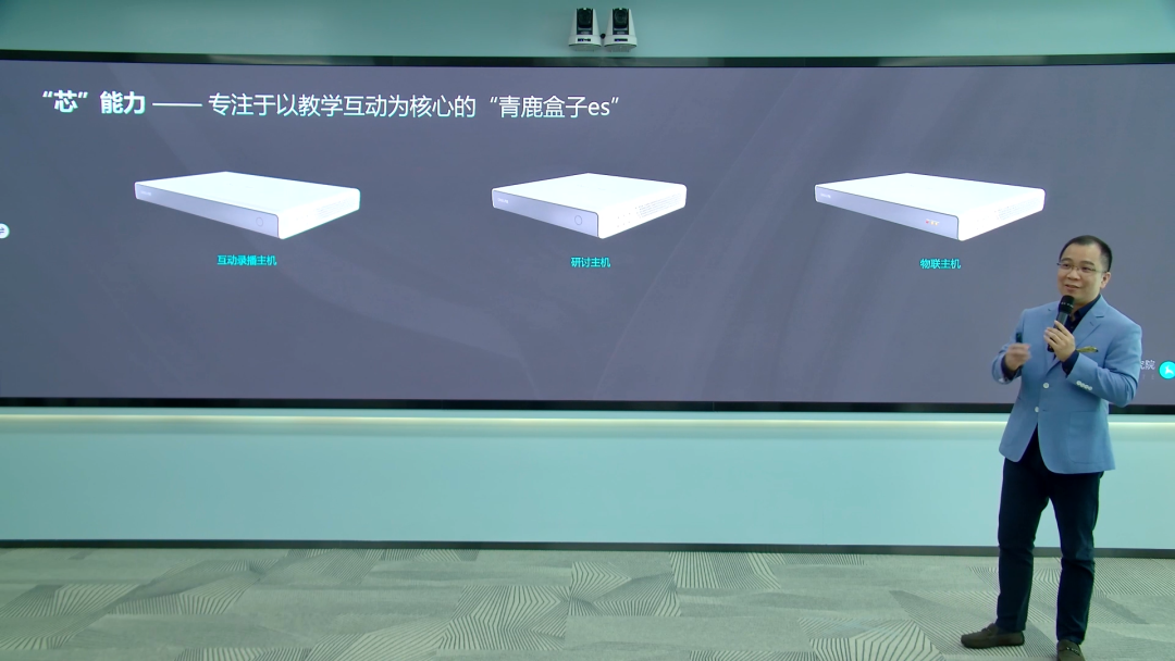 在緊接著的直播中,青鹿研究院院長廖力先生圍繞主題“科技啟迪教育智慧”向大家進行闡述。通過對國家大事件的回顧,可以明確當(dāng)前我國在教育方面聚焦課程質(zhì)量、教學(xué)管理,推進系統(tǒng)性的改革。隨著社會的飛速發(fā)展,教育現(xiàn)代化的發(fā)展趨勢越來越顯著,主要體現(xiàn)在教育要立德樹人,從學(xué)革命到質(zhì)量革命,推進人才培養(yǎng)模式變革。而當(dāng)前,青鹿為教育發(fā)展提供支持線上、兼容線上線下混合教學(xué)的信息化產(chǎn)品。新時代,教育信息化發(fā)展面對著新的機遇與新的挑戰(zhàn)。在機遇與挑戰(zhàn)并存的階段,青鹿提出了新思路,推出了一檔以專業(yè)視角解構(gòu)建設(shè)思路、規(guī)劃方案的中立欄目——《大家講堂》,旨在通過“大家”的分享、交流和碰撞,啟迪從業(yè)者,傳遞創(chuàng)新價值。廖力先生強調(diào)青鹿期望持續(xù)地請大家來講,通過大家關(guān)心的話題,講給大家聽。而要在教學(xué)上做到這一切,使用青鹿專注于教學(xué)互動為核心的“青鹿盒子系列產(chǎn)品”將事半功倍。當(dāng)前“青鹿盒子系列產(chǎn)品”有互動錄播主機、研討主機、物聯(lián)主機三款明星產(chǎn)品。三款產(chǎn)品是基于教學(xué)過程中不同方面的需求進行研發(fā)的,例如,互動錄播主機基于視頻互動的教學(xué);研討主機面向小組的研討式、探究式、自主分享式學(xué)習(xí)等。面對新時代的教育,青鹿提出新方法——依托校園信息化構(gòu)造教學(xué)場景,采用新模式——整體方案全面升級,使用新科技——全過程數(shù)據(jù)自動記錄,整體構(gòu)建有機融合的信息化教學(xué)環(huán)境,利用科技賦能創(chuàng)新教學(xué),最終達到從科技到智慧的目的。