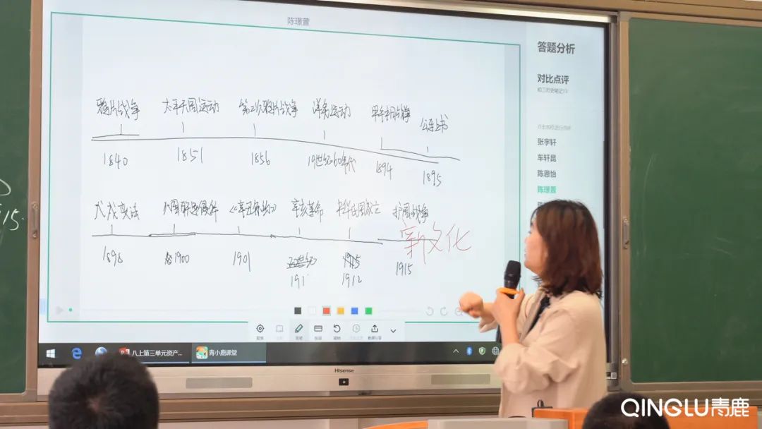 而對于歷史課來說,更注重知識體系的梳理、記憶,卞老師則給學生布置了紙筆繪制中國近代史時間軸的任務,并通過在教室大屏上隨機選擇學生的作答畫面進行點評的方式,更直觀地講解知識,提高課堂效率。