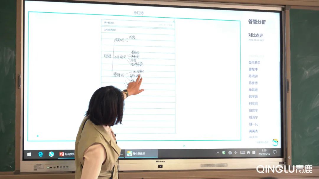 比如,歷史卞老師在課堂上通過青小鹿智慧紙筆系統下發截屏提問,讓學生用紙筆繪制中國近代史的時間軸(1840年-1915年)。在學生完成作答后,老師在教室大屏上隨機選擇學生的作答畫面進行點評與糾錯,課堂反饋高效又直觀。