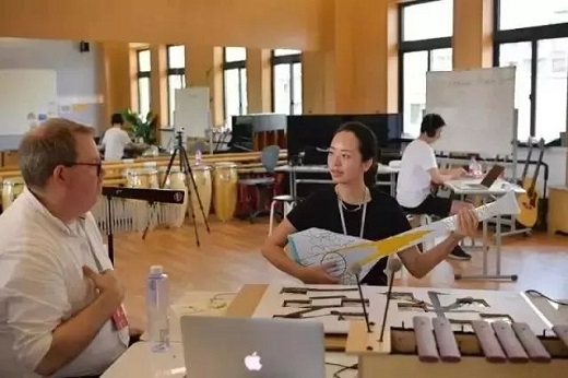 (云谷藝術(shù)周圖片:美國紐約大學(xué)的Alex教授攜其團(tuán)隊向?qū)W生展示變廢為寶:廢舊紙板、錫紙、電線,稚拙的繪畫點(diǎn)綴,最后成為簡易“樂器”。)