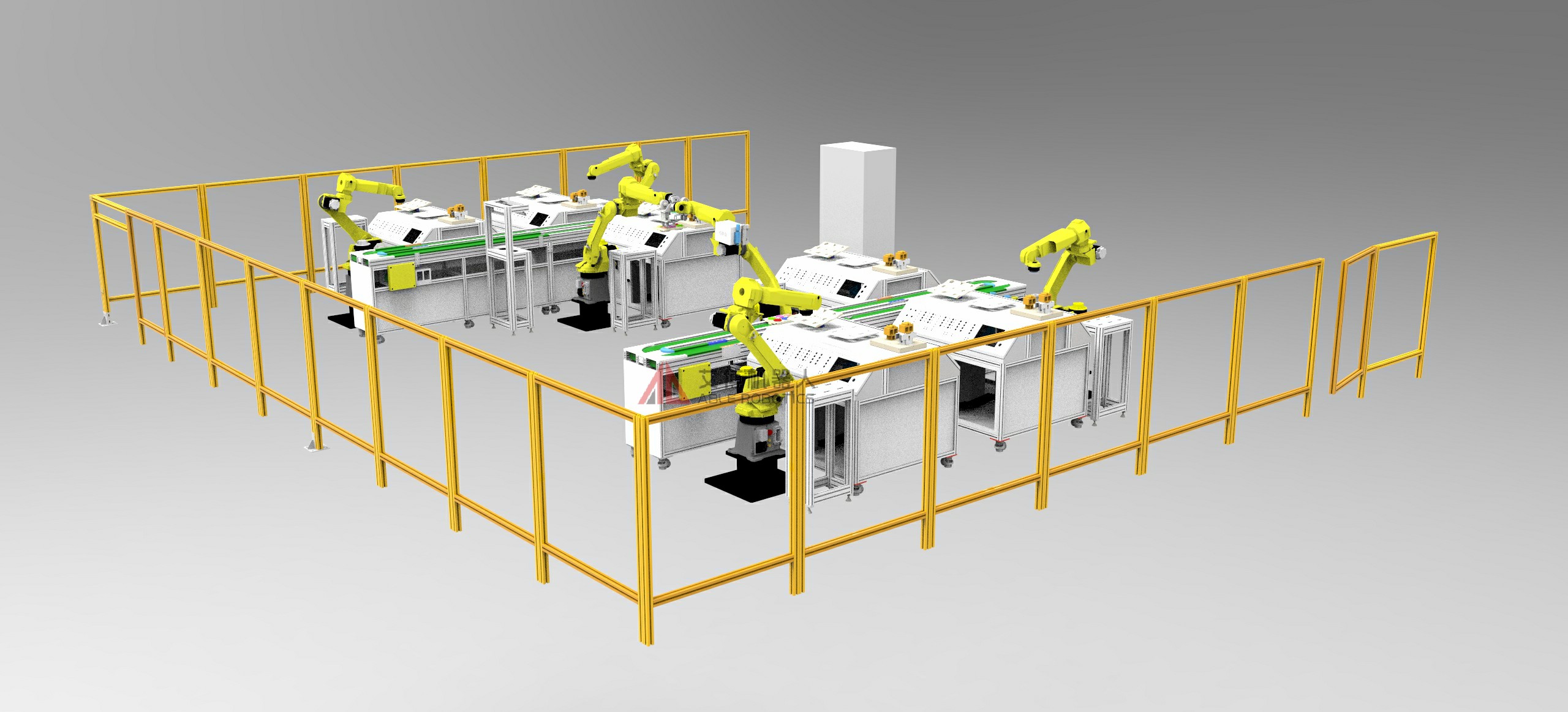機器人教學工作站由6個單工位教學實訓臺組成,可實現機器人手爪快換模擬教學、機器人搬運模擬教學、機器人行走軌跡模擬教學、電氣操作界面模擬教學、點膠模擬教學。