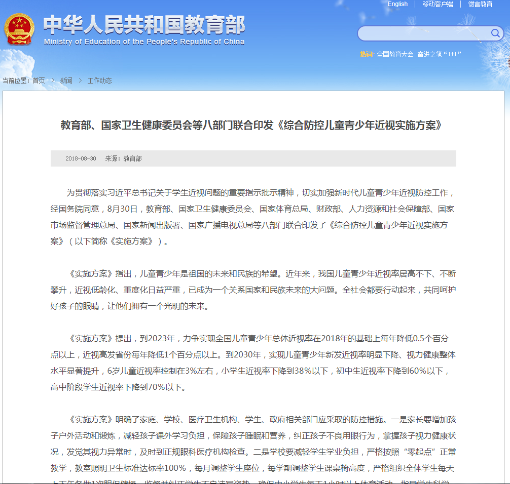 2018年8月30日開始,兒童青少年近視防控就上升到國家戰略層面。八部委聯合發文,設定階段性的近視防控指標,將兒童青少年近視防控納入政府業績考核。