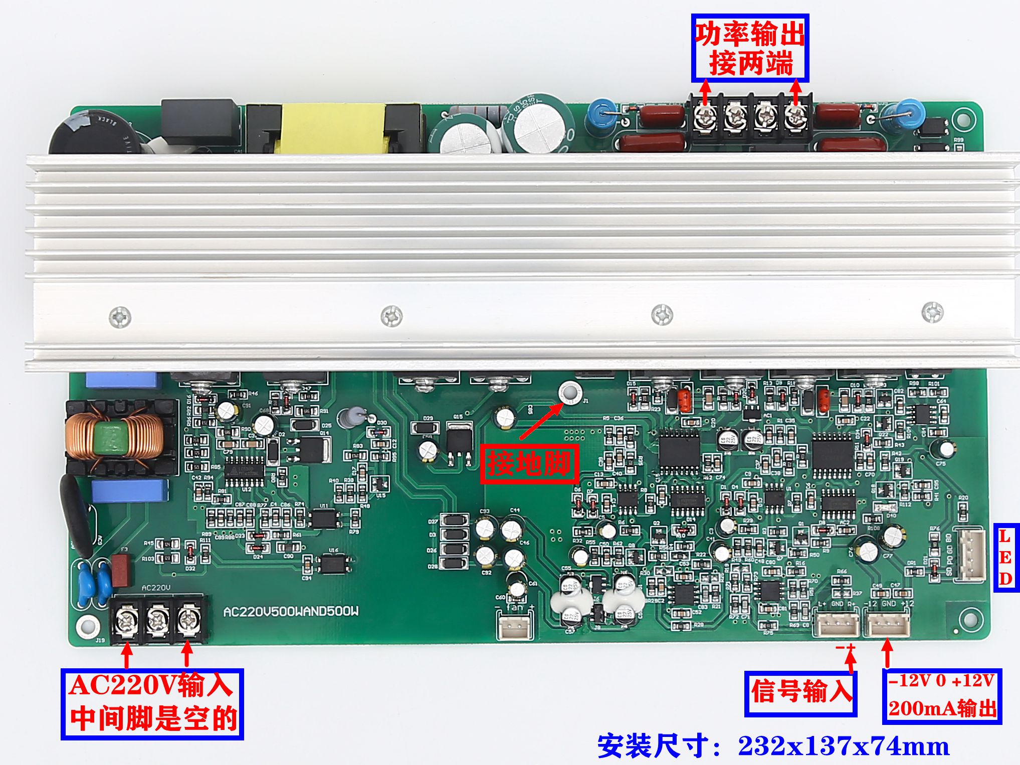 產品詳細介紹普寧市數字功放科技生產的XIAGUANGQU霞光曲品牌數字功放板,采用D類功放芯片和先進的開關電源技術,是我公司2018年開發生產的六代出口型帶電源單聲道數字功放一體組件,定阻輸出。具有性能穩定、音質優美、信噪比高、全自動保護,失真度低等特點。其功能可以滿足整機廠的要求,是開發新產品、升級產品、節約開發周期的理想配套產品。 特性指標 高 效 率:93% 輸出功率:400W 500W 600W 可根據需要選擇其他功率 定阻輸出:4-8Ω  供電電壓:AC220V 頻 寬:20Hz-20KHz 輸入信號:0db 信 噪 比:86db 失 真 度:1KHz 0.1%  500w @4-8Ω 保護功能:短路保護、過流保護、高溫保護 輸入、輸出接口: 工作狀態LED顯示接口 (400W以上有)用于顯示工作、信號、自動保護狀態 指示。 12V200mA風機電源輸出 用于外接散熱風機 + - 12V 200mA輸出 用于您或許需要配套的前級板電源。 智能風機控制: 當散熱器溫度上升到45度時,風機開始工作。