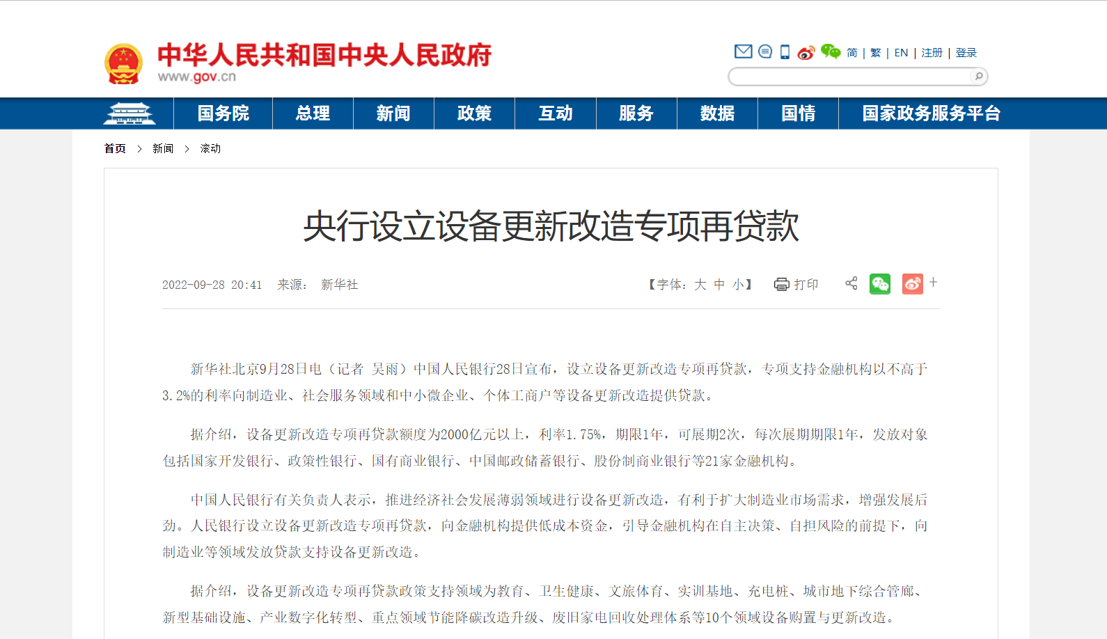 9月28日,中國人民銀行宣布設立設備更新改造專項再貸款,額度2000億元以上,支持金融機構以不高于3.2%的利率向教育、實訓基地、產(chǎn)業(yè)數(shù)字化轉型等10個領域的設備更新改造提供貸款。
