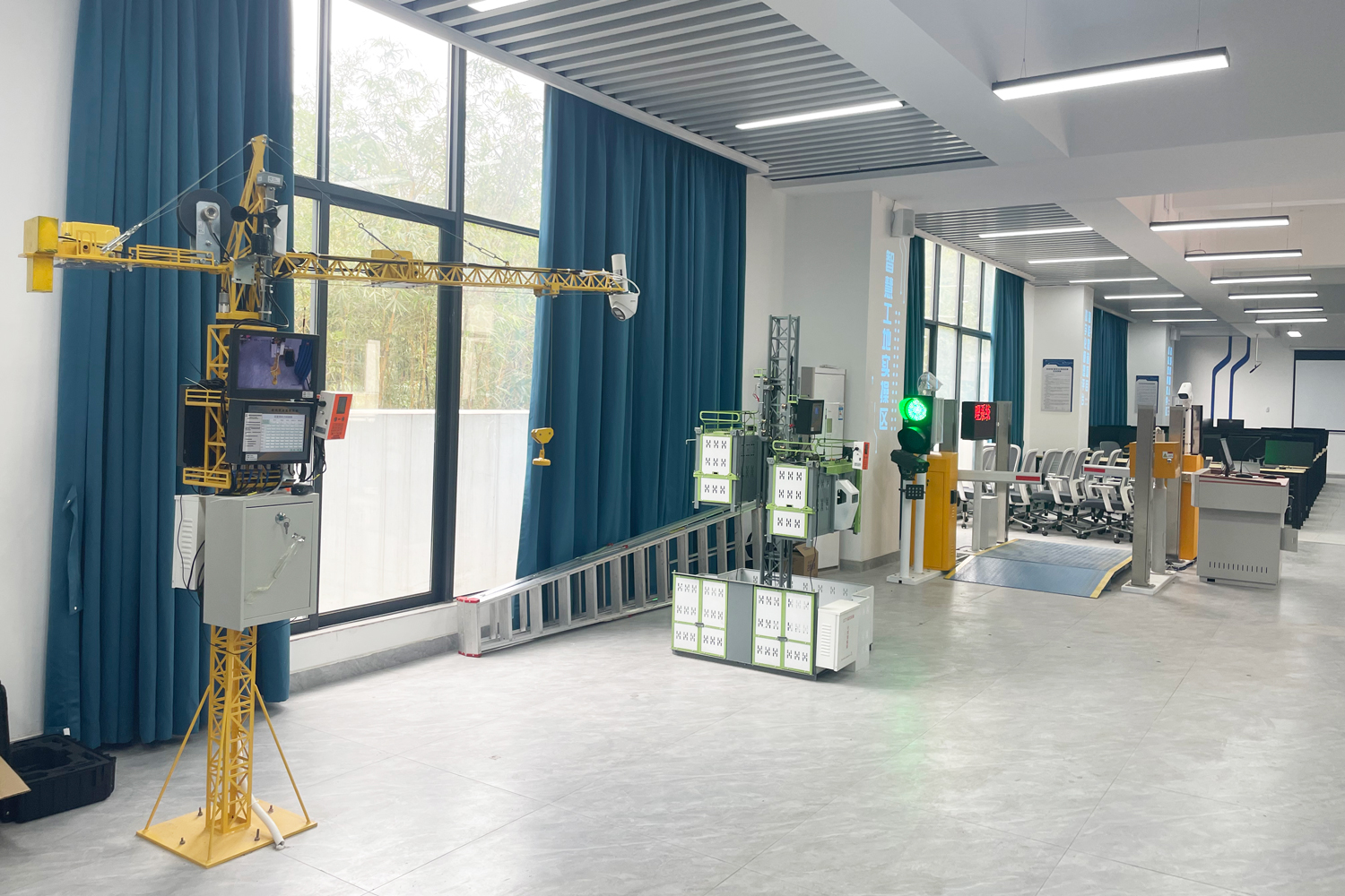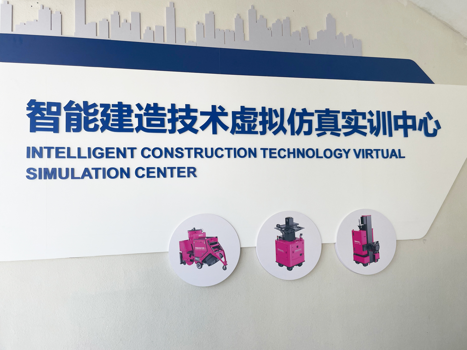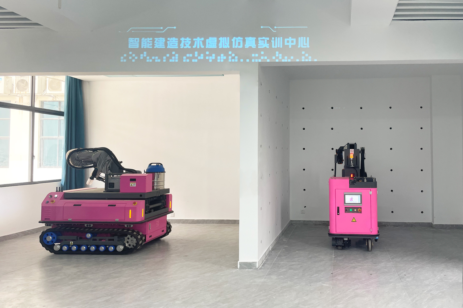 智能建造虛擬仿真實訓中心隸屬學校建筑學院,實訓中心內設有智慧工地廣泛使用的測量機器人,打孔機器人,螺桿洞封堵機器人,以及智慧工地塔吊、升降機、閘機等模型,并搭載了BIM+機器人施工管理平臺系統,可以對施工全生命周期進行可視化監測管理。
